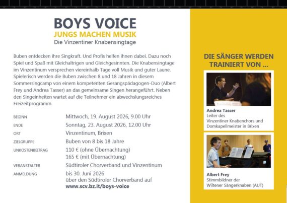 77. ordentliche Jahreshauptversammlung Samstag, 21. März 2026 um 10 Uhr in erster und um 15 Uhr in zweiter Einberufung im Raiffeisenhaus in Terlan Vorgesehen ist die Teilnahme von bis zu vier Delegierten je Mitgliedschor. Damit jede Stimme in unserem Verband zählt, freuen wir uns, wenn jeder Mitgliedschor mit einer Vertretung […]