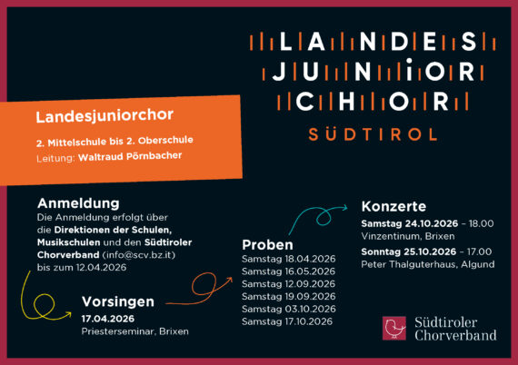 Singen ist toll… Singen in einer coolen Gemeinschaft ist noch viel toller! So lautet der Aufruf des Südtiroler Chorverbandes an die Kinder und Jugendlichen in ganz Südtirol. Das speziell für Kinder- und Jugendstimmen entwickelte und von erfahrenen Singpädagoginnen begleitete Chor-Projekt berücksichtigt vor allem die entwicklungsspezifischen Zeitfenster bei der Ausbildung einer […]