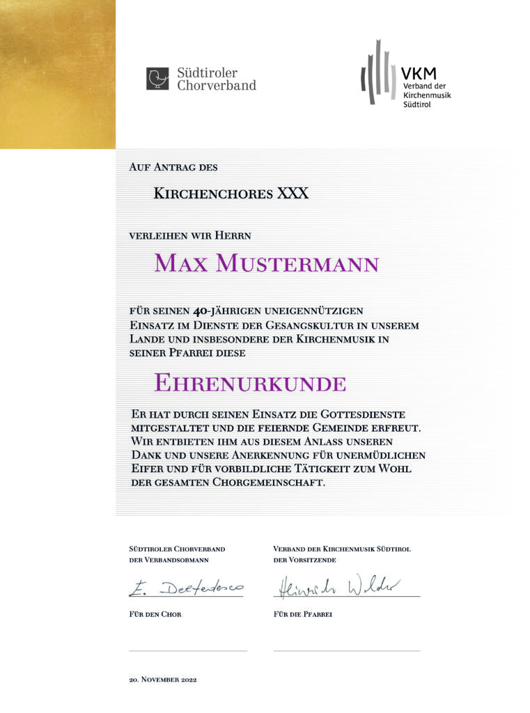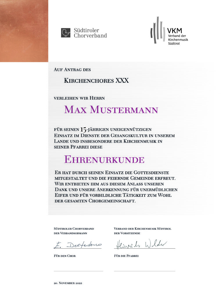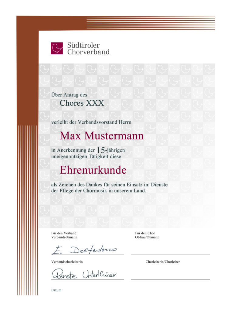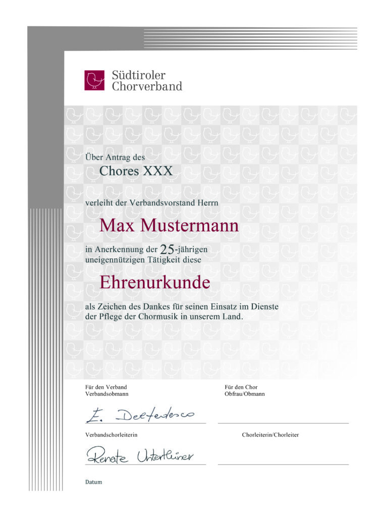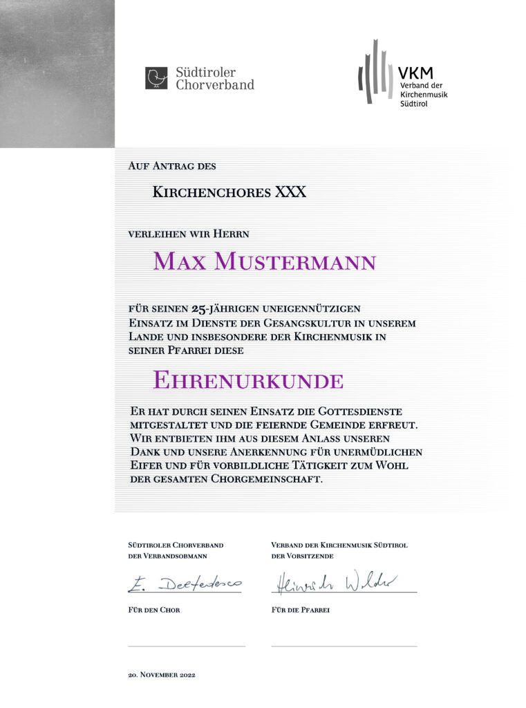 Ehrungen sind eine wichtige Form der Anerkennung und Wertschätzung der Leistungen unserer Chöre, ihrer Leiter*innen und Sänger*innen. Deshalb sehen wir als Dachverband ein umfangreiches System von Ehrungsmöglichkeiten vor. Die Urkunden werden mit den dazugehörigen Abzeichen kostenlos zur Verfügung gestellt. Gerne können die passenden Rahmen um € 20/pro Stück erworben werden. Neben unseren Urkunden gibt es auch gemeinsame Urkunden zusammen mit dem Verband der Kirchenmusik Südtirols.