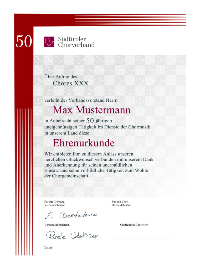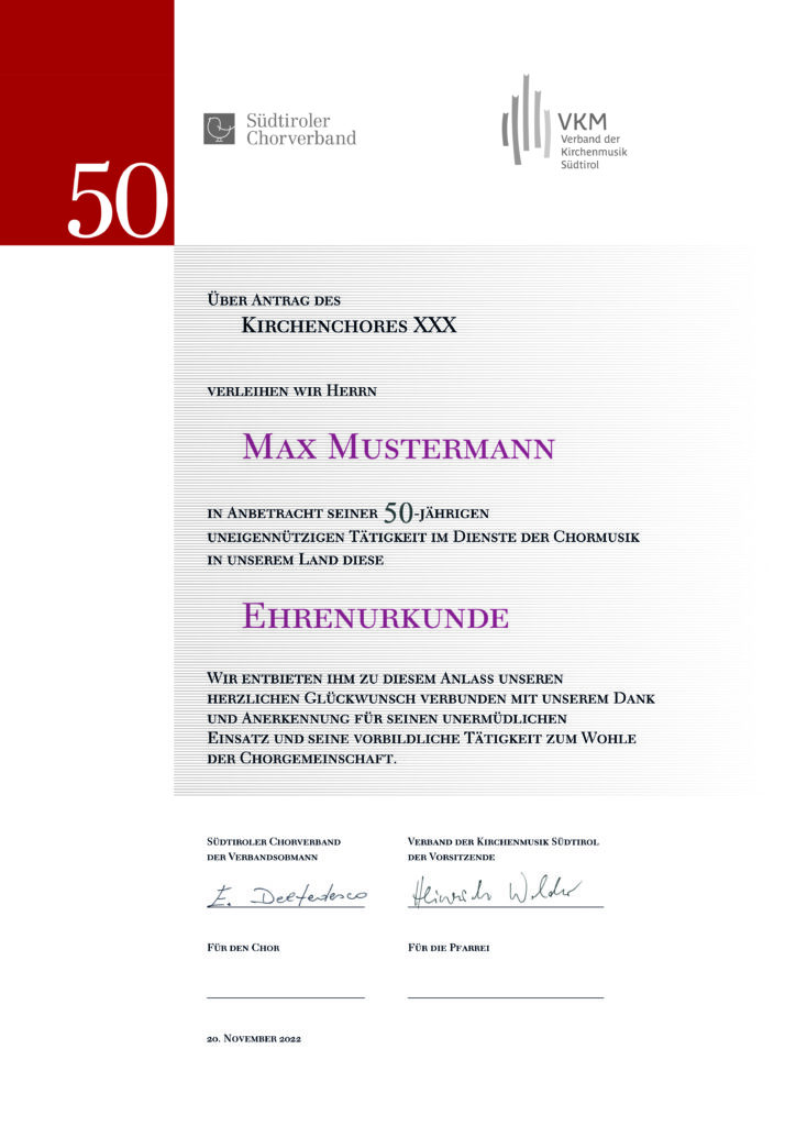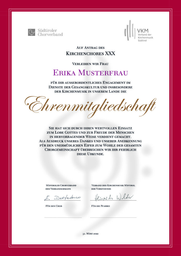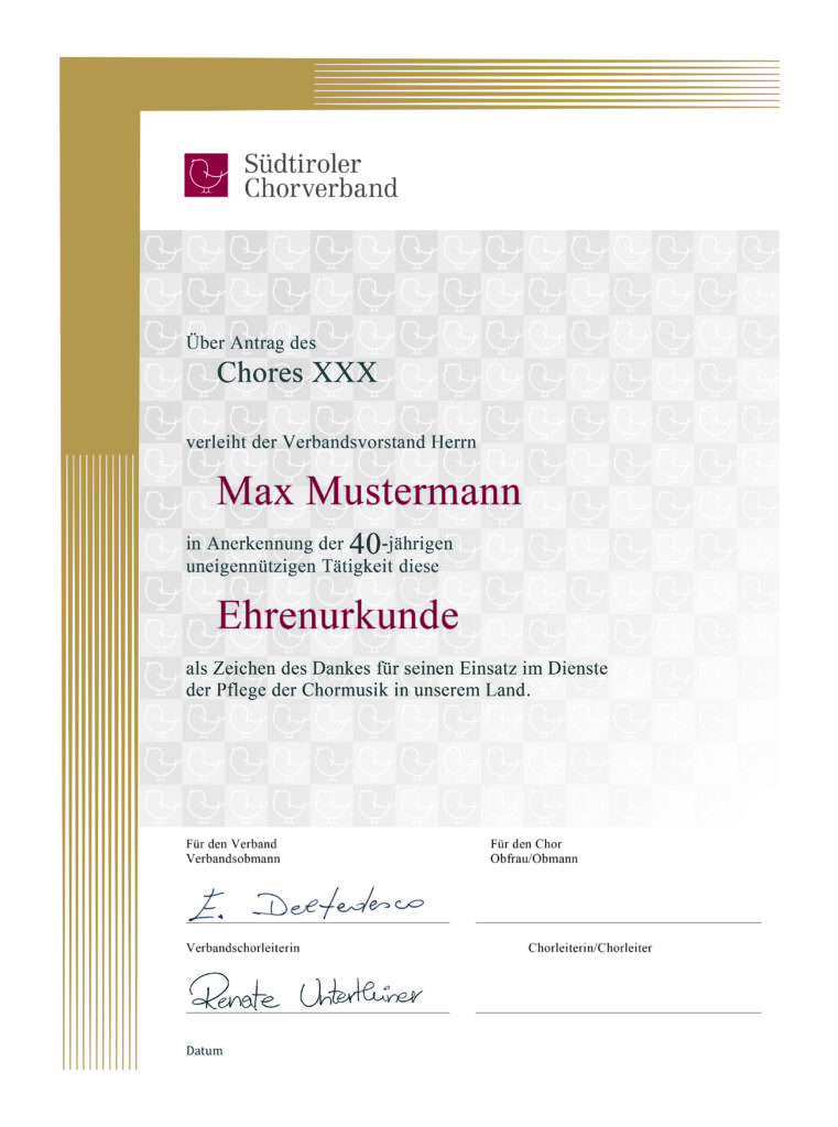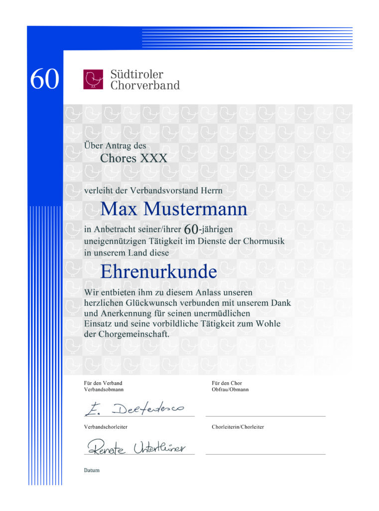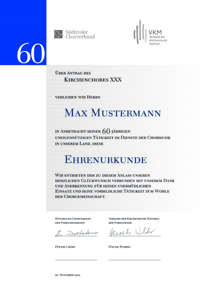 Ehrungen sind eine wichtige Form der Anerkennung und Wertschätzung der Leistungen unserer Chöre, ihrer Leiter*innen und Sänger*innen. Deshalb sehen wir als Dachverband ein umfangreiches System von Ehrungsmöglichkeiten vor. Die Urkunden werden mit den dazugehörigen Abzeichen kostenlos zur Verfügung gestellt. Gerne können die passenden Rahmen um € 20/pro Stück erworben werden. Neben unseren Urkunden gibt es auch gemeinsame Urkunden zusammen mit dem Verband der Kirchenmusik Südtirols.