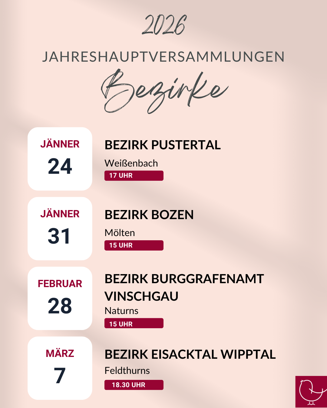 * Stammtisch für Chorleiter am SAMSTAG 17. Jänner 2026 in Neustift Details folgen noch. Alle Obleute, Chorleiter/innen und Interessierte des Bezirkes sind […]